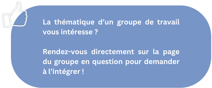 Rendez-vous directement sur la page d’un groupe de travail vous intéressant. Vous y trouverez un formulaire de candidature. Vous pouvez vous inscrire à un ou plusieurs groupes de travail.